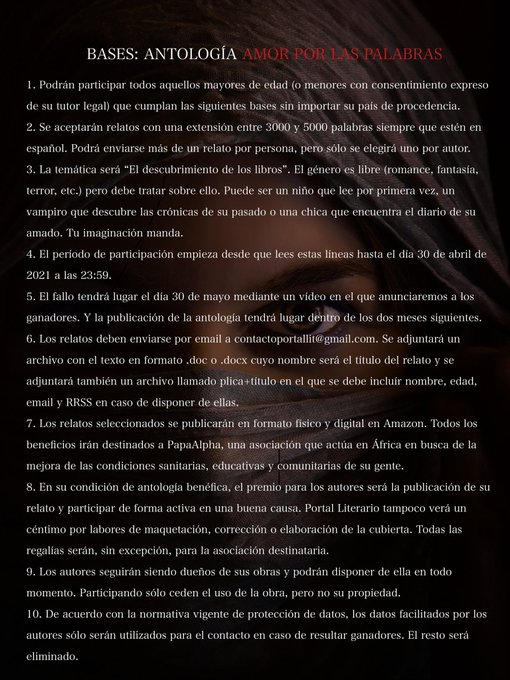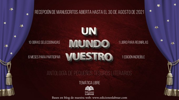 Finalmente, quería compartirles aquellas convocatorias en las cuales tengo pensado participar pero todavía no he comenzado a escribir. Bueno, de hecho, en una de ellas sí ya he comenzado, pero el relato está todavía muy verde. Me hará mucha ilusión poder escribir un relato para todas y cada una, pues las premisas me parecen fantásticas: desde los vampiros de Bram Stoker del Círculo de LoveCraft, los «Cuentos Primaverales» de «Islas de Papel y Tinta» hasta el descubrimiento de los libros por los maravillosos administradores de «Portal Fantasía», pasando por la convocatoria «Un Mundo Vuestro» de Ediciones Labnar, con temática libre. Y cómo olvidar la convocatoria Orgullo Zombi 2021.